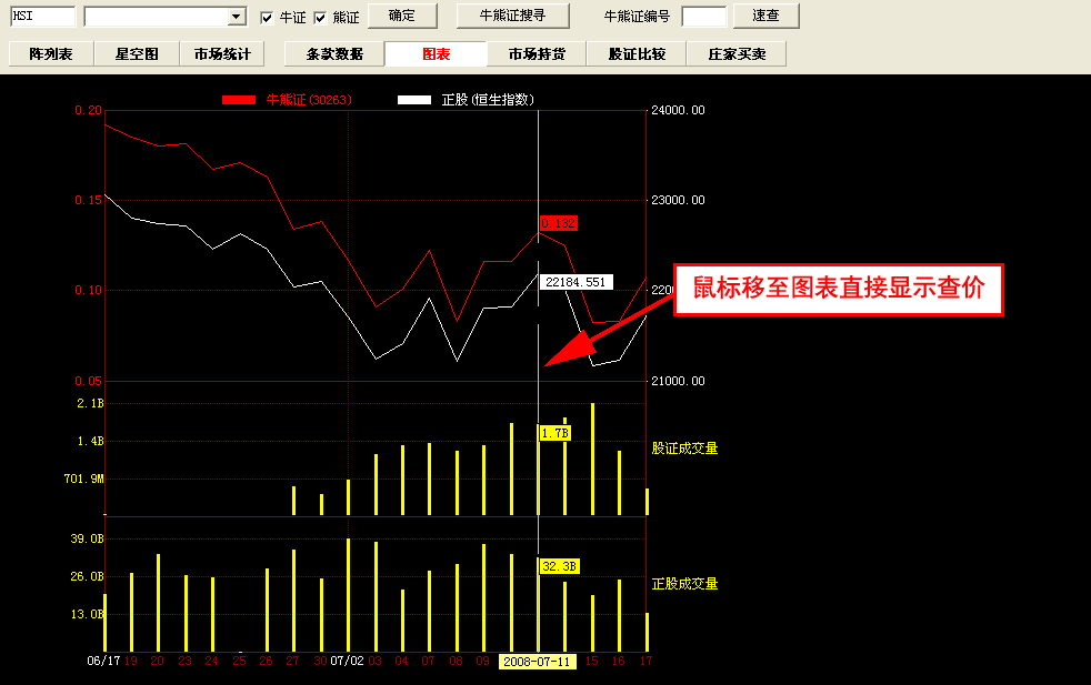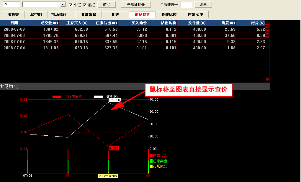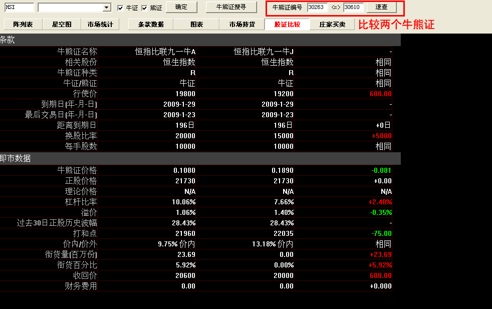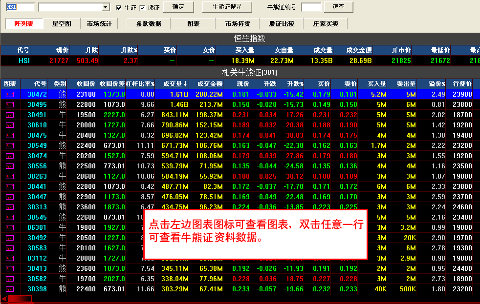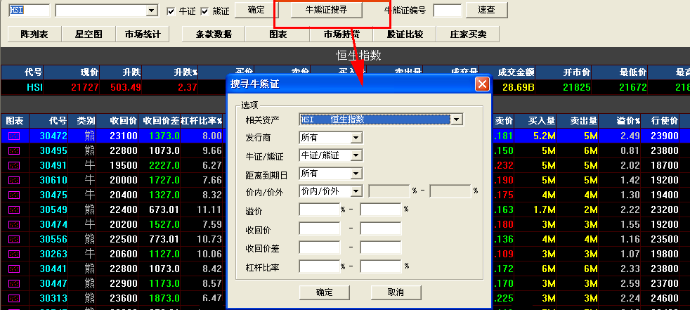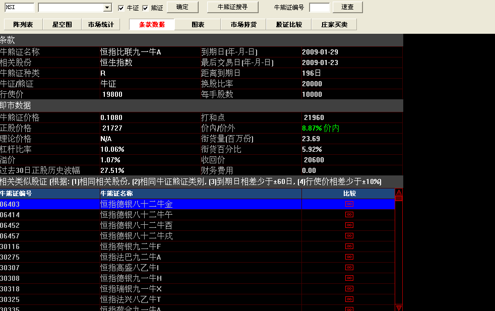 牛熊证指南针包括:最新牛熊证资料数据,通过牛熊证搜寻设置条件搜索牛熊证,可切换星空图;牛熊证分析功能强大,包括条款及数据、图表、市场持货、牛熊证比较及庄家买/沽平均价表等等。