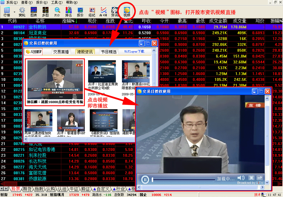 点击工具栏“视频”图标,打开视频直播,视频直播是由“交易日”授权使用的直播及港股资讯点播等服务。
